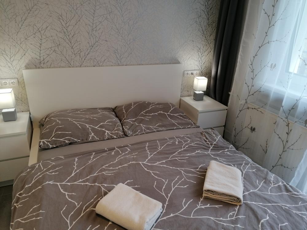 后面的房间有两张床,110厘米宽。第一个房间里还有一张沙发床(140*200厘米)。此公寓的厨房配置齐全(微波炉,冰箱,水壶,餐具,盘子),还有电视。卫生间有淋雨和马桶。